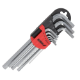 Set de 9 chei hexagonale combinate lungi cu capătul de lucru HEX, cunoscute și sub denumirea de "autobuze". Cheile sunt fabricate din oțel aliat cu crom pentru rezistență ridicată și rezistență la coroziune. Cheile sunt atașate la un mâner confortabil și durabil care asigură accesul rapid la chei.